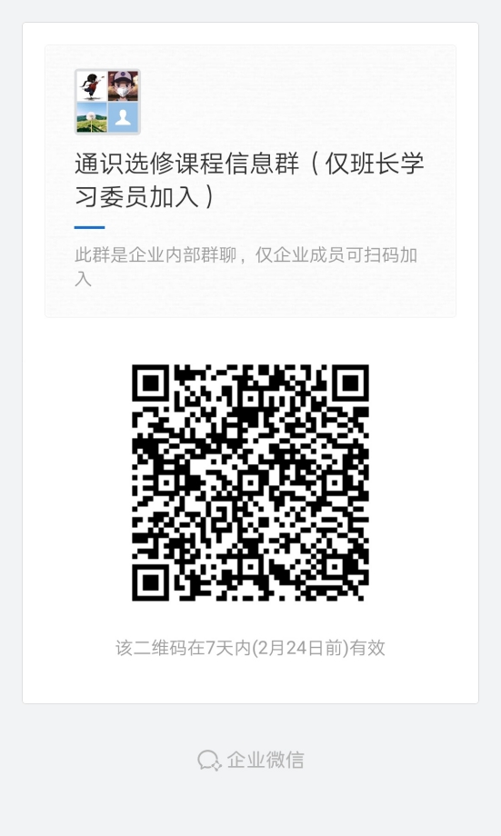 选课期间,各班级班长或学习委员可扫描二维码(见附件2)加入通识选修课程信息群,有任何问题均可在群里反映。我们为相关课程配备了助教,做好课程管理,辅助学生学习,进行答疑解惑。选课结束后,各课程助教老师会通过企业微信与同学们取得联系,请及时关注相关信息。