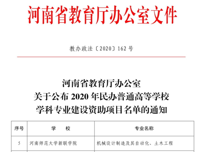 近日,河南省教育厅发布了《河南省教育厅办公室关于公布2020年民办普通高等学校学科专业建设资助项目名单的通知》(教办政法〔2020〕162号),我校机械设计制造及其自动化和土木工程两个专业凭借突出的专业实力和专业特色被确定为河南省2020年民办普通高等学校学科专业建设资助项目。