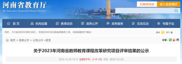 近日,河南省教育厅印发了《关于2023年河南省教师教育课程改革研究项目评审结果的公示》,