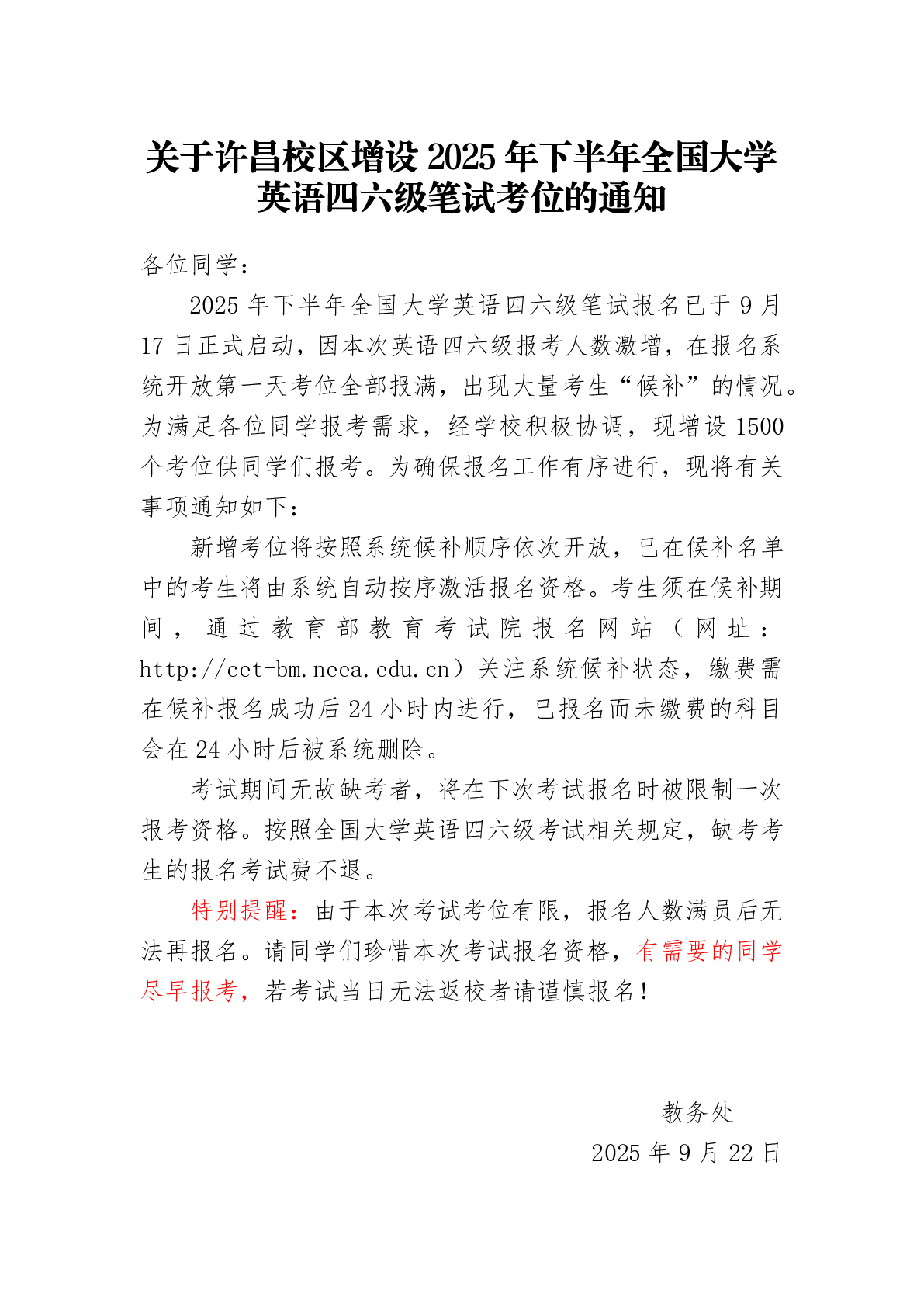 关于许昌校区增设2025年下半年全国大学英语四六级笔试考位的通知